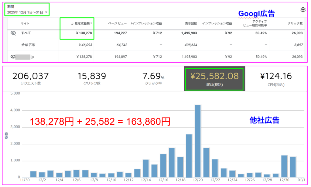 最初はなかなか成果が出なかったんですが、2025年8月に新しくブログをはじめると、10、11月で4万5000円まで成果を伸ばしてきました。その後、12月に16万円越えを達成。
